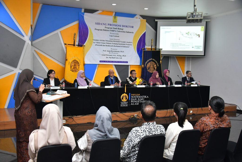 Sidang terbuka ini menghadirkan Prof. Anom Bowolaksono, Ph.D. (Departemen Biologi FMIPA UI) sebagai promotor, serta Astari Dwiranti, M.Eng., Ph.D. (Departemen Biologi FMIPA UI), dan Dr. Puji Budi Setia Asih (Pusat Riset Biologi Molekuler Eijkman dan BRIN) sebagai ko-promotor.