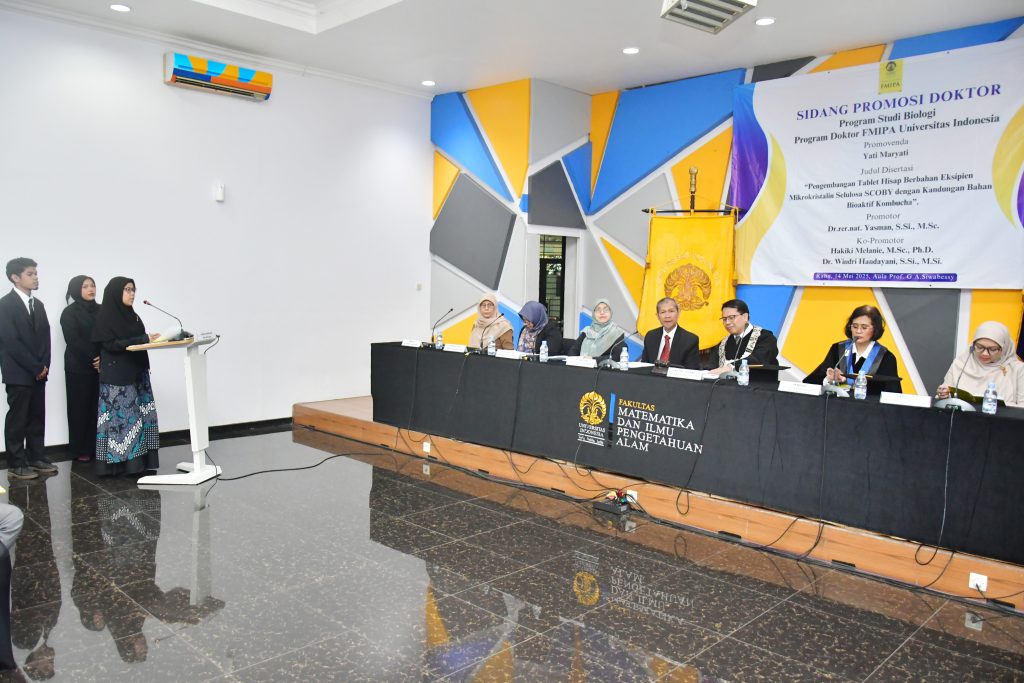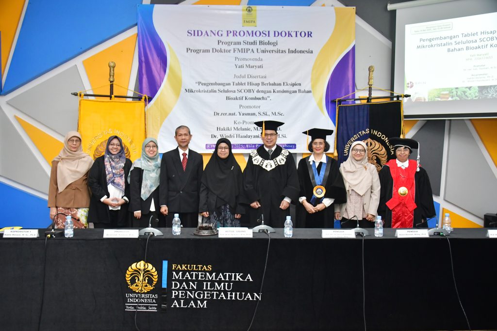 Fakultas Matematika dan Ilmu Pengetahuan Alam Universitas Indonesia (FMIPA UI) menggelar sidang terbuka promosi doktor Program Studi Biologi pada Rabu (14/5), di Aula Prof. Dr. G.A. Siwabessy, Depok. Dalam sidang tersebut, promovenda Dr. Yati Maryati, yang merupakan peneliti dari Pusat Riset Kimia, Badan Riset dan Inovasi Nasional (BRIN) berhasil mempertahankan disertasinya yang berjudul “Pengembangan Tablet Hisap Berbahan Eksipien Mikrokristalin Selulosa SCOBY dengan Kandungan Bahan Bioaktif Kombucha”. Ia dinyatakan lulus dengan predikat cumlaude dan meraih Indeks Prestasi Kumulatif (IPK) 3,88.