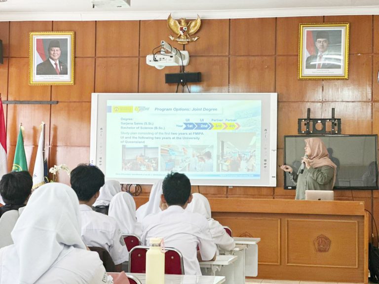 Depok, 8 April 2026 – Fakultas Matematika dan Ilmu Pengetahuan Alam Universitas Indonesia (FMIPA UI) melalui Tim Kelas Internasional melakukan promosi Program Kelas Khusus Internasional (KKI) ke dua sekolah menengah atas, yaitu SMAN 1 Depok pada Senin (6/4) dan SMA Islam Dian Didaktika pada Selasa (7/4). Kegiatan ini merupakan bagian dari strategi FMIPA UI untuk memperkenalkan program KKI yang resmi dibuka pada 2026 bagi program studi Sarjana (S1) Fisika, Kimia, dan Biologi.