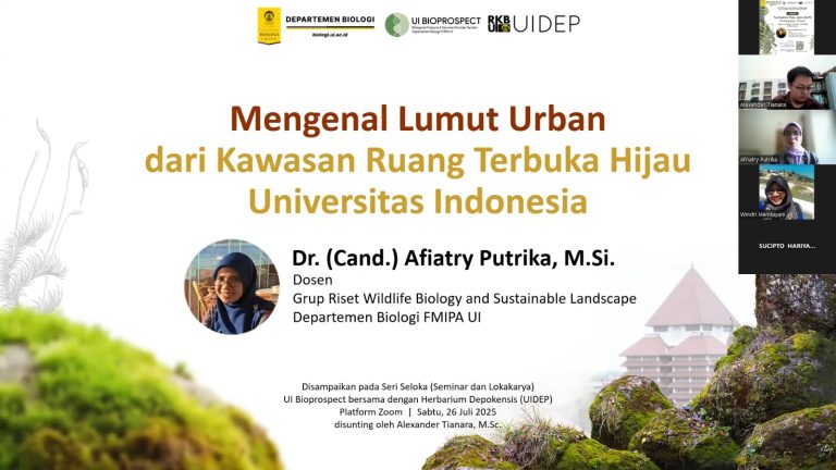 Dalam upaya memperluas wawasan publik mengenai keanekaragaman tumbuhan di kawasan urban, Fakultas Matematika dan Ilmu Pengetahuan Alam Universitas Indonesia (FMIPA UI), melalui Departemen Biologi dan Herbarium Depokensis (UIDEP), menyelenggarakan pemaparan ilmiah yang disampaikan oleh Afiatry Putrika, M.Si., dosen sekaligus peneliti di bidang botani, khususnya kelompok tumbuhan lumut (Bryophyta).